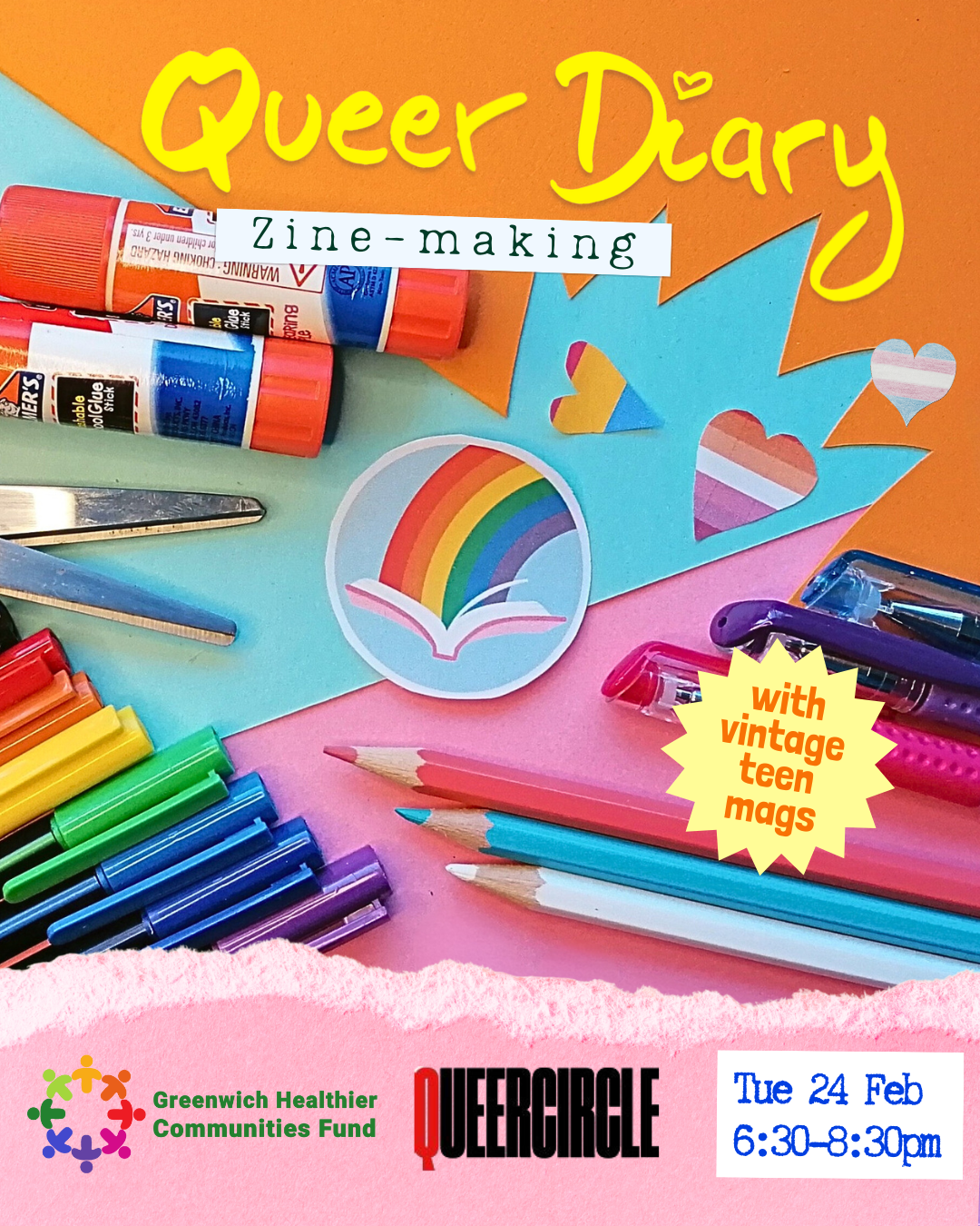 All crafting materials are provided by us: Felt-tips + gel pens + stickers + stencils + a stack of old teen magazines to cut up & re-cycle for your own queer-tastic zine ✂️✂️