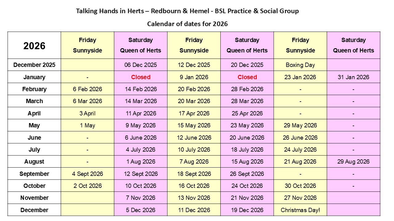 The aim of our group is to socialise, make friends, share ideas and information and to most of all to practice British Sign Language.